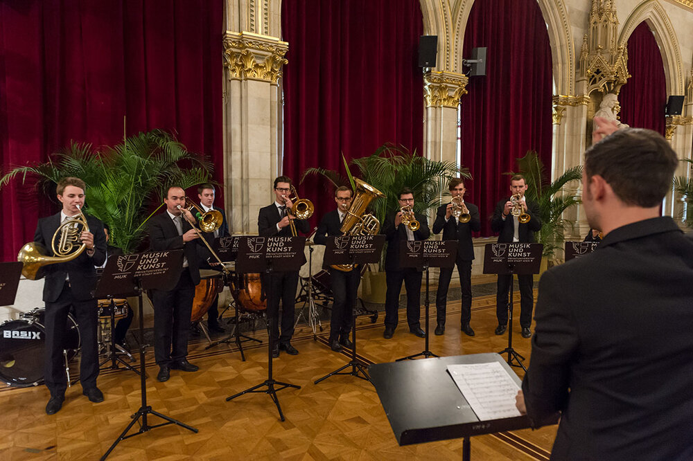 Eröffnet wurde die Feier, die bereits zum neunten Mal in Folge im Wiener Rathaus stattfand, durch die eigens von Florijan Lörnitzo komponierte Skyline-Fanfare. Unter der Leitung von Roman Rindberger wurde diese von einem Bläserensemble der MUK einstudiert und erstmals zur Aufführung gebracht.