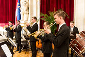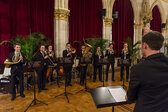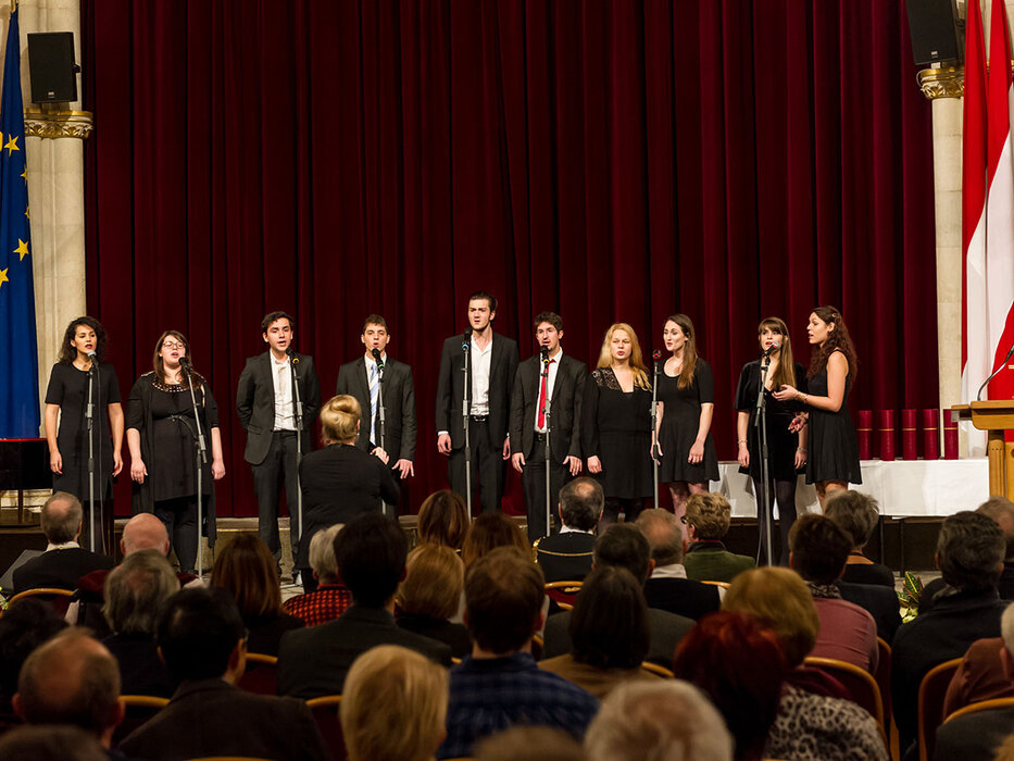 Anschließend war erstmals das Publikum dazu eingeladen, selbst Teil der Akademischen Feier zu werden: Das Bläserensemble, diesmal unter dem Dirigat des MUK-Studierenden Christoph Huber, spielte die Europahymne, gesanglich begleitet durch die Gäste der Feier.