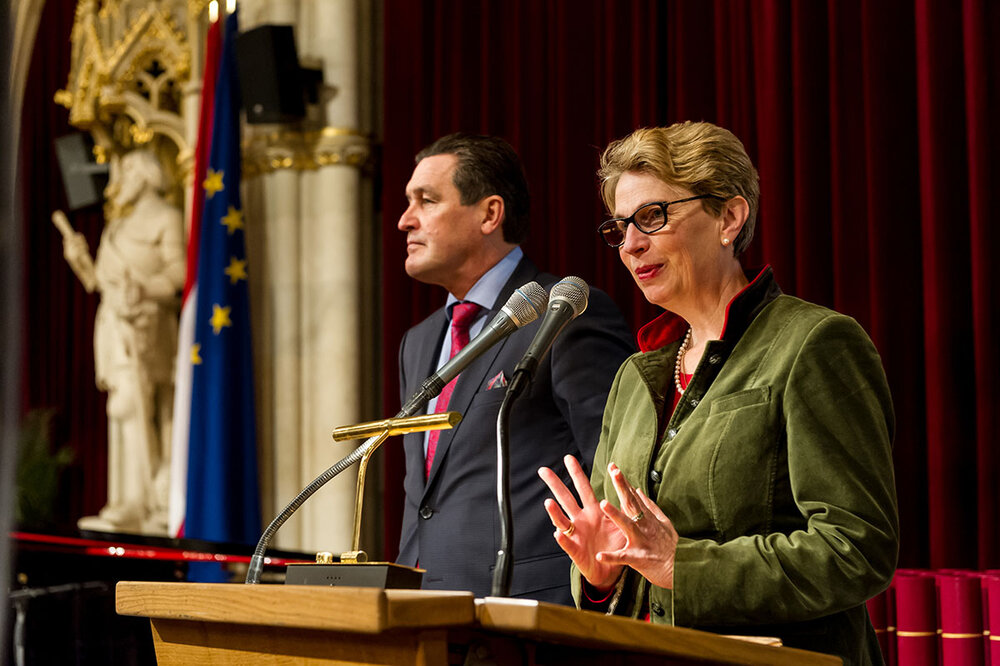 Im Anschluss richteten Dr.in Martina Schmied (Vorsitzende des Universitätsrates, Bereichsdirektorin für Personal und Revision) und Komm.Rat Peter Hanke (Geschäftsführer Wien Holding) begrüßende Worte an die Absolventinnen und Absolventen.
