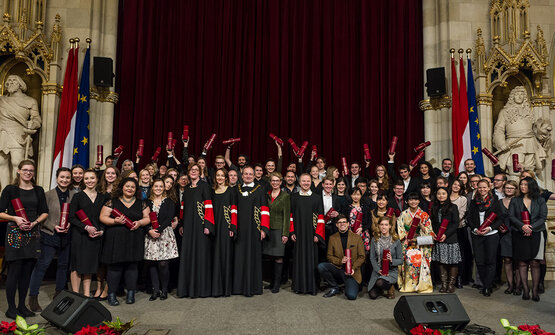 Bei der diesjährigen Sponsionsfeier am Dienstag, 29. November wurden den Absolventinnen und Absolventen der letzten Monate ihre akademischen Grade Bachelor und Master of Arts im feierlichen Ambiente des Großen Festsaals im Wiener Rathaus verliehen.