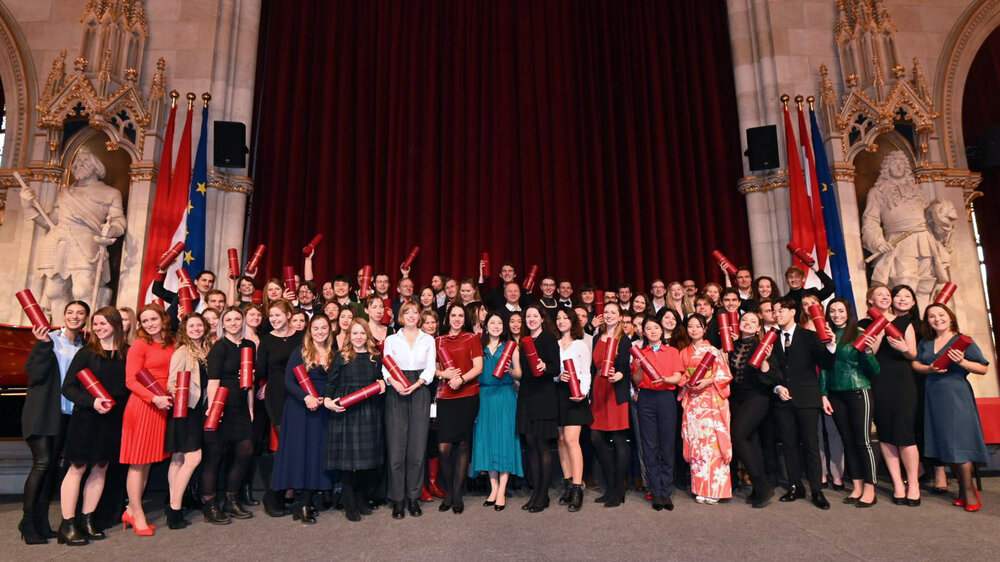 Rektor Dr. Andreas Mailath-Pokorny und Prorektorin Dr.in Rosemarie Brucher sowie Dekan Univ.-Prof. Michael Posch (Fakultät Musik) überreichten über 70 jungen Künstler*innen die Urkunden und Zeugnisse im festlichen Ambiente im Großen Festsaal. Bereits zum 12. Mal in Folge konnte die Feier – dank der Unterstützung der Stadt Wien – im Wiener Rathaus abgehalten werden.