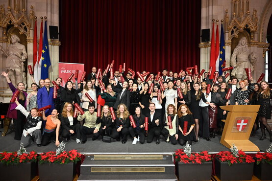 Bei der diesjährigen Sponsionsfeier der MUK am Donnerstag, 5. Dezember wurden den Absolvent*innen des letzten Studienjahrs ihre akademischen Grade Bachelor und Master of Arts im feierlichen Ambiente des Großen Festsaals im Wiener Rathaus verliehen.