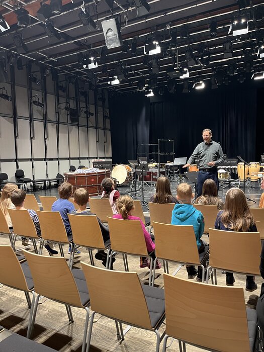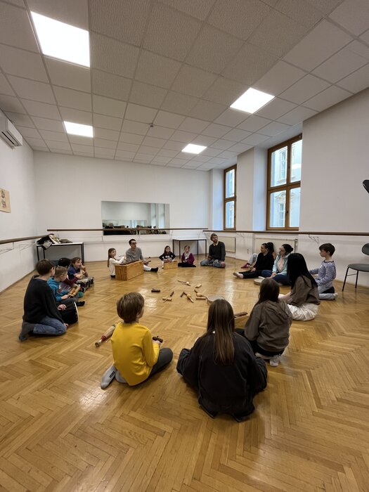 Danach hieß es: Ich höre was, was du nicht siehst. Es wurde gemeinsam mit Gerhard Pöhl und einigen MUK-Studierenden kreativ improvisiert, gesungen, getanzt und an unterschiedlichen Orff-Instrumenten ein rhythmisches Miteinander probieren.