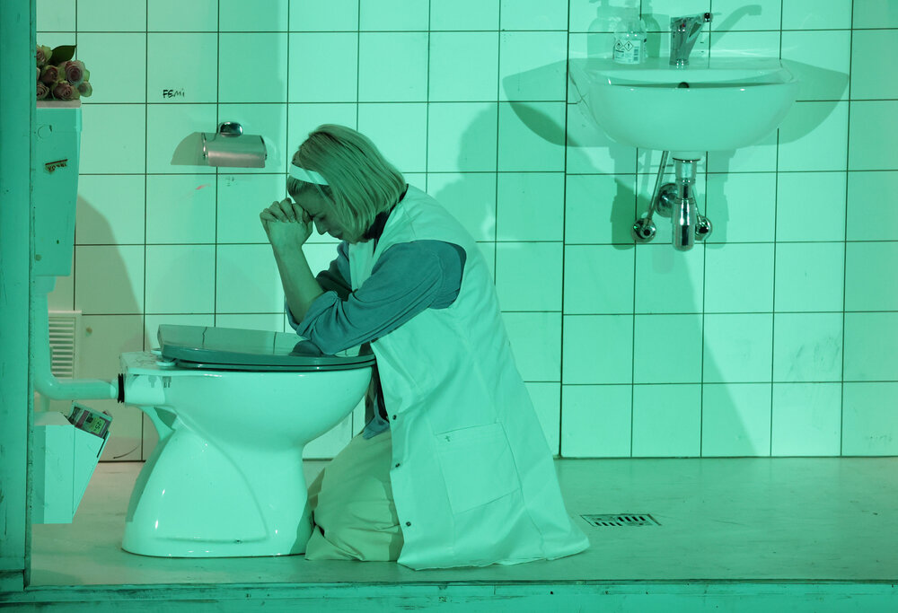 Minou M. Baghbani, Fabian Cabak, Paula Carbonell Spörk, Elias Eisold, Amrito Geiser, Samira Kossebau, Fabia Matuschek und Laetitia Toursarkissian (3. Jahrgang Schauspiel der MUK) reisten gemeinsam mit Dekanin Karoline Exner an und präsentierte sich im Bockenheimer Depot mit Im Glashäusl, einer Produktion in Kooperation mit dem Schauspielhaus Wien, die im Mai in der Wiener Porzellangasse Premiere feierte. Ausgehend von vier Kurzdramen von Amir Gudarzi, Thomas Köck/Gerhild Steinbuch, Lisa Wentz und Robert Woelfl stellen sich Regisseurin Anne Bader und die Studierenden Fragen nach politischer und individueller Verantwortung: Was bleibt als Rest in einer Gesellschaft, die ihre eigenen Umbrüche kaum verdaut? Die öffentliche Toilette dient als Verhandlungsort: Ein politischer Körper gibt stellvertretend für alle eine persönliche Erklärung ab — irgendjemand muss sich ja schließlich entschuldigen. Obwohl der ganze Abfall nun wirklich nicht von uns stammen kann, davon sind die Mitarbeitenden der Entsorgungsfirma überzeugt. Wer bezahlt für den Wohlstand und wer wischt die großen Sprüche wieder von den Klowänden?