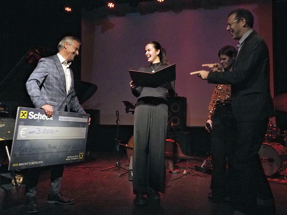 In diesem Jahr entschied sich die mit externen Musiker*innen, MUK-Lehrenden, Journalist*innen und Musikmanager*innen prominent besetzte Fachjury für Katarina Kochetova und ihr Projekt OVERDUBS IN JAZZ — Jazz Beyond Borders: The Overdub Sessions. Übergeben wurde der Preis von Gerhard Zachl, dem Prokuristen von Raiffaisen Wien, für die Moderation sorgte MUK-Professorin und Jazz-Bassistin Beate Wiesinger.