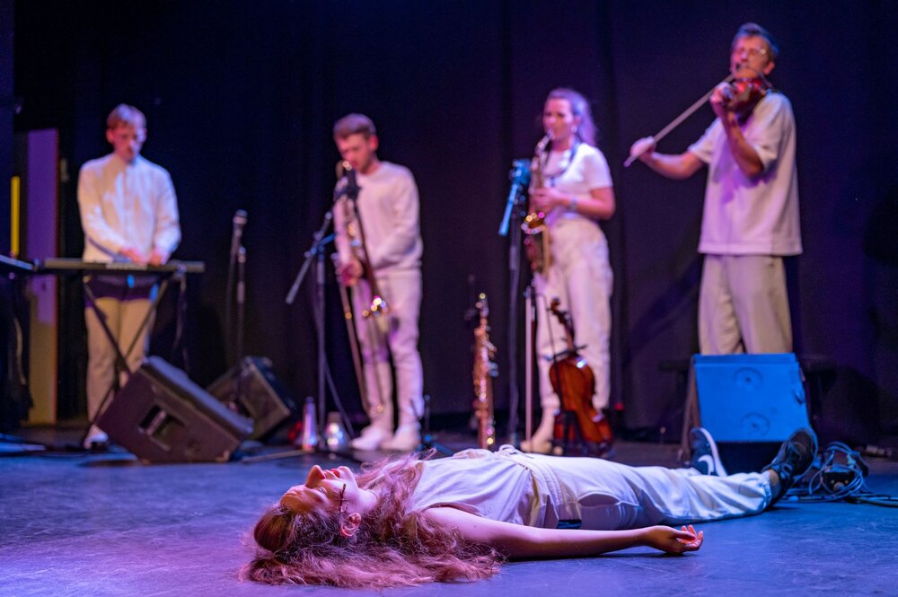 Das fünfköpfige Ensemble „zwischen uns“ (Andrea Edlbauer, Saxophon; Gregor Fussenegger, Violine; Daniel Holzleitner, Posaune; Julia Mikusch; Schauspiel und Constantin Hemetsberger alias Hruod Seekind, Texte und elektronisches Sounddesign) bot am 22. Oktober Einblicke in die vielfältigen Arbeiten, die seit der Preisverleihung 2020 entstanden sind. Vox Humana erzählt vor dem Hintergrund einer zunehmend technologisierten, computergesteuerten Welt, von der Sprache der Macht und der menschlichen Ohnmacht, wenn es um Gefühle, wie die Liebe geht, und verbindet verschiedene Kunstdisziplinen wie die zeitgenössische klassische Musik und das Schauspiel mit Jazz und Improvisation.