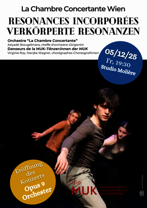 Die Studierenden des 2. Jahrgangs Zeitgenössischer und Klassischer Tanz der MUK werden am Fr, 5. Dezember, 19:30 Uhr im Studio Molière im Rahmen des Kooperationskonzerts „Verkörperte Resonanzen“ mit dem Orchester „La Chambre Concertante“ auf der Bühne stehen. Zur Aufführung gelangt Schuberts 5. Sinfonie.