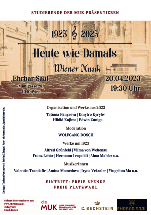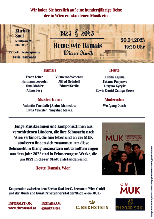 Die vier jungen Komponist*innen der MUK übernehmen dabei auch die musikalische Leitung. Präsentiert werden bei Heute wie Damals — Wiener Musik von Werke von Franz Lehár, Alma Mahler, Alban Berg, Vilma von Webenau, Hermann Leopoldi, Alfred Grünfeld sowie Uraufführungen von Werken aus dem Jahr 2023. Durch das Programm dieser neuen Kooperation zwischen Ehrbar-Saal und dem Studiengang Tasteninstrumente, Musikleitung und Komposition der MUK (Studiengangsleitung: Jean Beers) führt der MUK-Lehrende Wolfgang Dosch. Interpretationen von Valentin Trandafir, Amina Mamedova, Iryna Vekszler, Yingshuo Ma, u. a. ergänzen die abwechslungsreiche Aufführung.