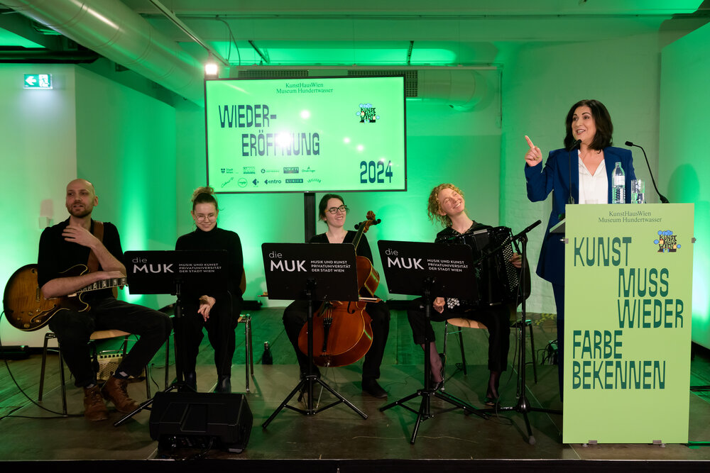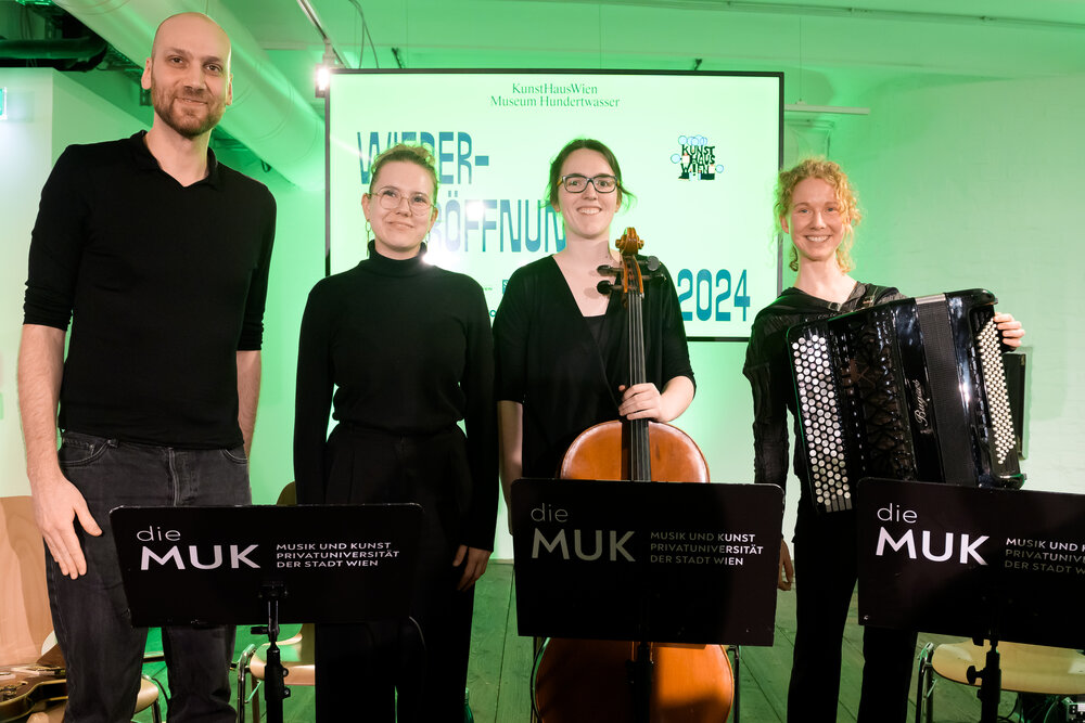 Beim Pre-Opening am 28. Februar war ein musikalisches Programm mit Chansons von Arik Brauer — Zeitgenosse, Freund und Weggefährte Friedensreich Hundertwassers — zu vernehmen: Studierende des Studiengangs Instrumental- und Gesangspädagogik an der MUK führten die Klassiker „Wia a Hund“, „Dschiribim, dschiribam“ und „Sie ham a Haus baut“ auf. Mit dabei: Sarah Machač (Gesang), Samuel Wolf (Gitarre), Pia Madlener (Akkordeon) und Fiorentina Harasko (Violoncello). Die Studierenden erfüllten damit KunstHausWien Direktorin Gerlinde Riedl einen besonderen Wunsch und begeisterten neben den anwesenden Gästen auch Kulturstadträtin Veronica Kaup-Hasler, Wirtschaftsstadtrat Peter Hanke sowie Wien Holding-Geschäftsführer Kurt Gollowitzer.