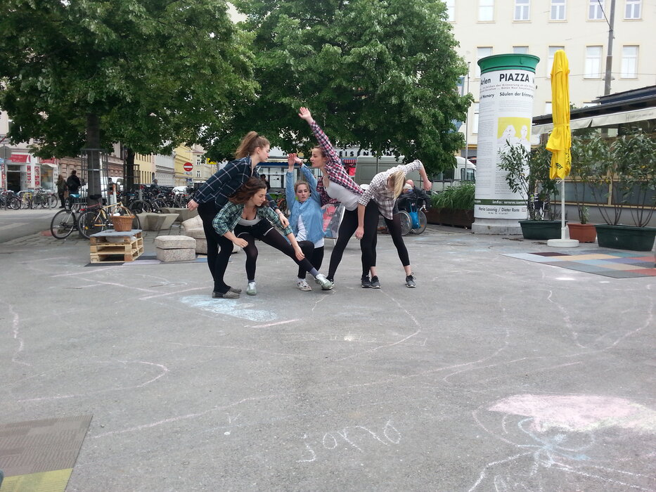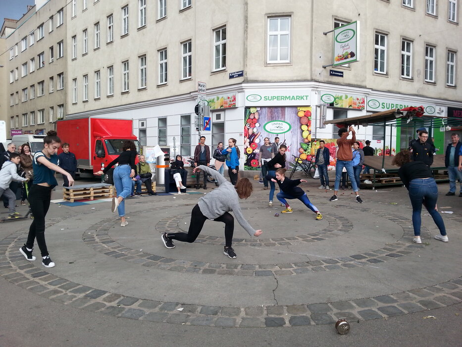 MUK-Tänzer*innen performen beim StraßenKunstFest am Brunnenmarkt