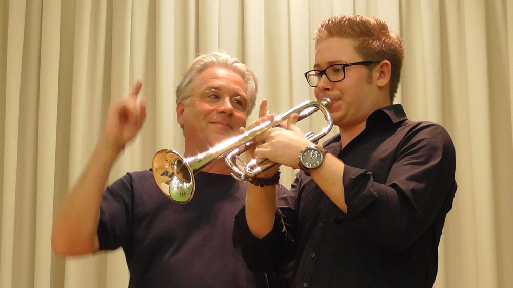 Hardenberger verstand es z. B. zu vermitteln, daß an der Realisierung dieser Musik – Zimmermanns Trompetenkonzert darf mittlerweile zum Kernrepertoire der Musik des 20. Jahrhunderts gezählt werden – tatsächlich der ganze Körper teilhaben darf, soll die Aufführung gelingen. Er erläuterte darüberhinaus wie mit der in der Musikausbildung aller Ebenen und aller Genres leider weit verbreiteten „Angst vor falschen Noten“ konstruktiv umzugehen sei und gab dafür höchst beeindruckende verbale Erklärungen und praktische Beispiele. So gelang es ihm, den Studierenden Matthias Kernstock innerhalb kurzer Zeit gleichsam über sich selbst hinauswachsen zu lassen – sehr zur Freude aller Beteiligten und des begeisterten Publikums.
