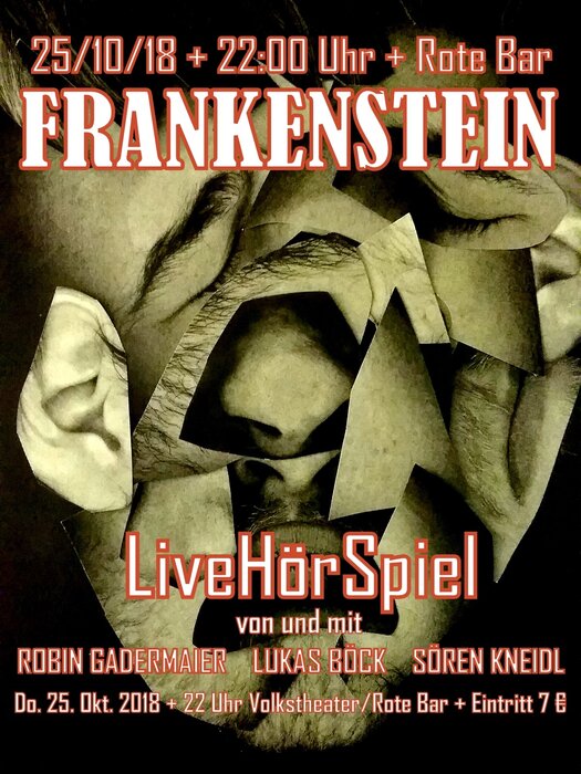 Am 25. Oktober präsentiert MUK-Absolvent Sören Kneidl eine Live-Hörspiel-Variante des vor 200 Jahren erschienenen Horror-Meisterwerks Frankenstein von Mary Shelley. Das Hörspiel ist in Eigenarbeit für die Abschlusspräsentation an der Musik und Kunst Privatuniversität der Stadt Wien in der Sparte Schauspiel entstanden und ist das Ergebnis der Zusammenarbeit mit den beiden ehemaligen Jazz-Studenten Lukas Böck (Schlagzeug) und Robin Gadermeir (Jazz-Bass).