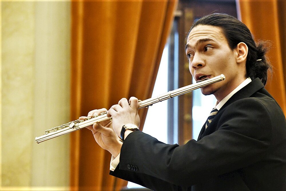 Albert Szentgyörgyváry, Jg. 1999. Bereits mit sechs Jahren begann Szentgyörgyváry das Flötenspiel, absolvierte die Musikschule seines Heimatortes Siklós (Ungarn), setzte das Musikstudium am Konservatorium in Pécs fort und belegt derzeit den Bachelorstudiengang Orchesterblasinstrumente/Flöte an der Musik und Kunst Privatuniversität der Stadt Wien. Der junge Flötist ist seit Anfang 2023 im Orchester des Nationaltheaters in Győr (Ungarn) engagiert. Bei internationalen Wettbewerben in Bratislava, Budapest und Belgrad errang Szentgyörgyváry Erste Preise. Den bislang größten Erfolg konnte Albert Szentgyörgyváry im Frühjahr beim renommierten Flötenwettbewerb von Kraków erringen, wo er den Dritten Preis errang.
