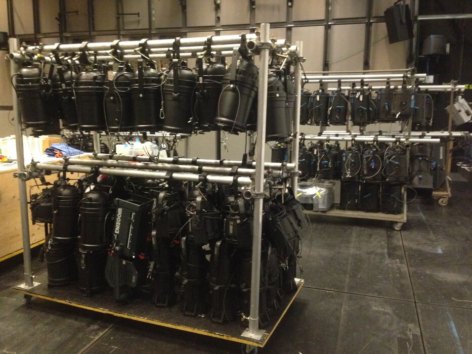 Parallel dazu muss die alljährliche Sommerrevision durchgeführt werden: Jeder einzelne Scheinwerfer - und davon gibt es immerhin rund 150 Stück - wird dazu von der Decke genommen, gereinigt und wieder montiert, ebenso alle Kabel. Ein Fixpunkt der Instandhaltungsarbeiten ist auch die Reinigung aller Räumlichkeiten des Theaters und insbesondere der Unterbühne. Diese wird nicht nur als Lagerraum genutzt, sondern beherbergt auch die Hubpodien, mit denen die Bühne angehoben und abgesenkt werden kann. In diesem Bereich setzt sich bei jeder Produktion Schmutz ab - vor allem wenn Federn, Sand oder ähnliches in den Aufführungen verwendet werden. Auch die Hubpodien müssen gereinigt werden: Der alte Ölfilm wird abgezogen und ein neuer aufgetragen. Durch einen frischen Anstrich wird auch die Bühne wieder fit für das nächste Semester gemacht.
