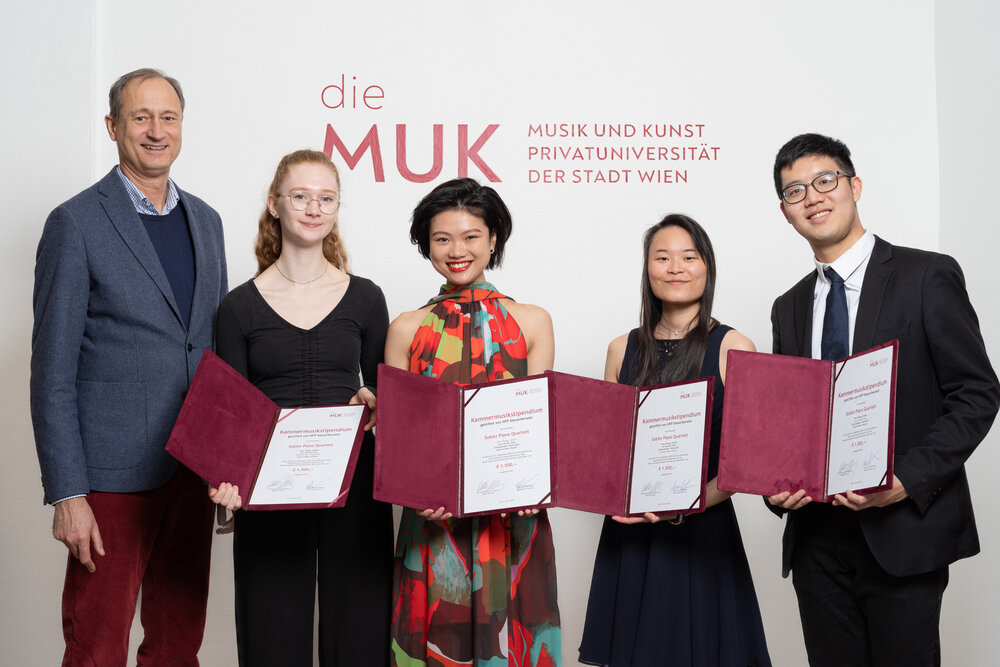 „Die Jury hatte es nicht leicht, mit den spannenden Werkzusammenstellungen und ausgezeichneten Interpretationen war es nicht einfach, eine Entscheidung zu treffen“ sagt Arno Steinwider, Vorsitzender der Jury. Letztendlich hat sich beim Auswahlspiel Ende Dezember 2022 das Subito Piano Quartet durchgesetzt. Im Rahmen der Urkundenübergabe wurden die Gewinner*innen von Rektor Andreas Mailath-Pokorny beglückwünscht.