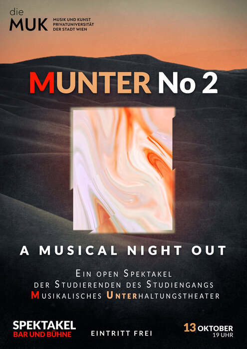 Open Mic, Open Stage — Open Spektakel! Die Studierenden des Studiengangs Musikalisches Unterhaltungstheater (MUNTER) präsentieren ein selbst kuratiertes Musicalprogramm als Open Spektakel und eben dort. Mit ihrem selbst gestalteten Abend entführen sie uns in ihre Welt voller fesselnder Geschichten und großer Emotionen — gefüllt mit Leidenschaft und ihrem Herzblut. Unter ihrem Motto „Kreativität kennt keine Grenzen!“ laden sie zu einer Musical Night Out!