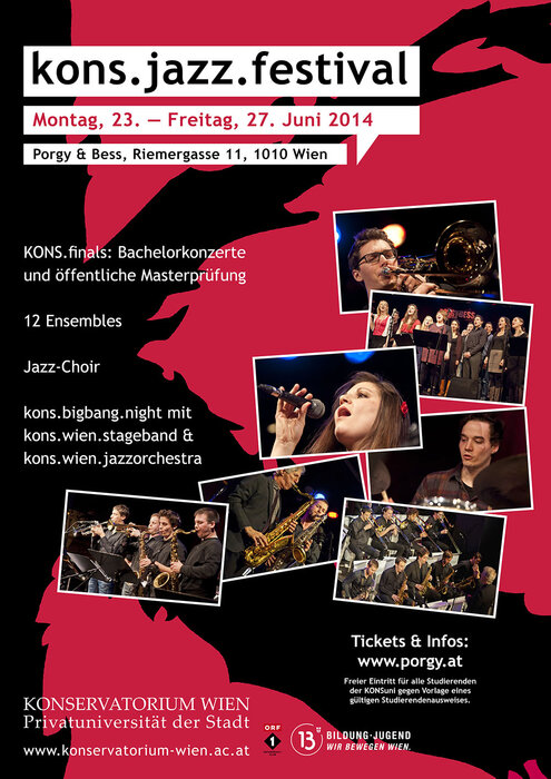 Dass der Ausdruck "Festival" kein Lippenbekenntnis ist, zeigt der Studiengang Jazz der Fakultät Musik der Konservatorium Wien Privatuniversität an fünf aufeinanderfolgenden Abenden im Wiener Jazz & Music Club Porgy & Bess, denn zur Aufführung gelangen insgesamt 30 Acts mit über 240 MusikerInnen: Beim kons.jazz.festival, das sich aus vier kons.jazz.nights und der kons.bigbang.night (jeweils um 20 Uhr) zusammensetzt, werden sämtliche KONS.finals (Bachelorkonzerte und öffentliche Masterprüfung), sowie zwölf Ensembles, der Jazz-Choir und die zwei Big Bands präsentiert. Ein besonderer Höhepunkt wird dabei die kons.bigbang.night mit der kons.wien.stageband (conducted by Johannes Herrlich) und dem kons.wien.jazzorchestra (conducted by Roman Schwaller) am Freitag, 27. Juni 2014 sein.