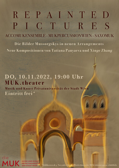 1874 schuf Modest Mussorgsky den Klavierzyklus Bilder einer Ausstellung. Ausgehend von einer Vielzahl an Interpretationsmöglichkeiten machen sich Studierende der MUK, unter der fächerübergreifenden Leitung von Harry Demmer, Michael Krenn und Grzegorz Stopa auf die Suche nach ihrer eigenen Version dieses Meisterwerks. Dabei werden alle Bilder in neuen Klangfarben erstrahlen, welche die ungewöhnliche Kombination von Akkordeon, Schlagwerk und Saxophon ermöglicht. Ergänzt durch Originalliteratur für diese Instrumentenkombination sowie neuen Kompositionen der MUK-Studierenden Tatiana Panyaev und Xinge Zhang verspricht dieses Konzert ein eindrucksvolles und facettenreiches Klangerlebnis zu werden!